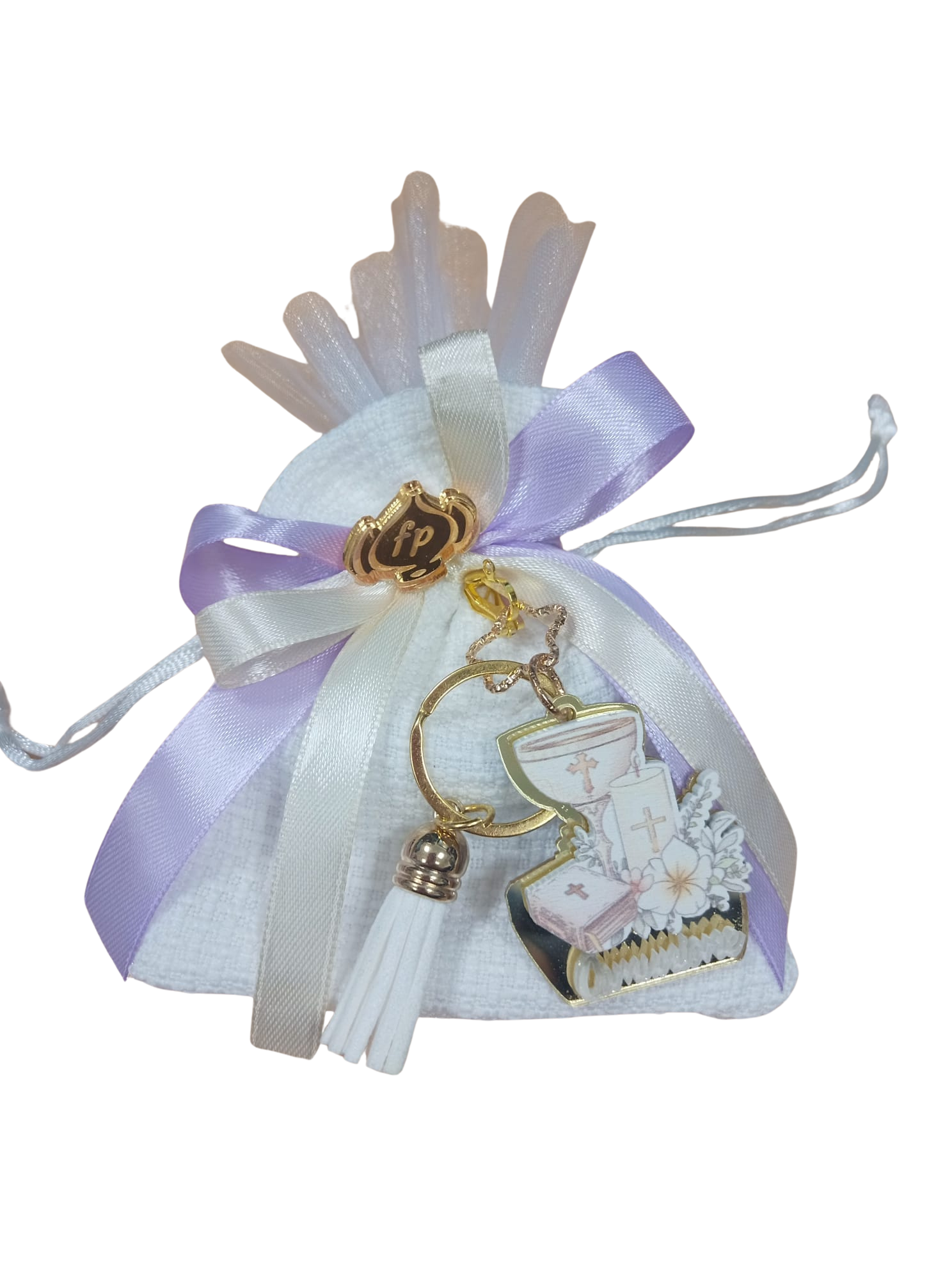 Il sacchettino, morbido e armonioso nelle forme, è impreziosito da un elegante fiocco e da un splendido gadget con simboli della COMUNIONE, impreziositi da una nappina bianca.