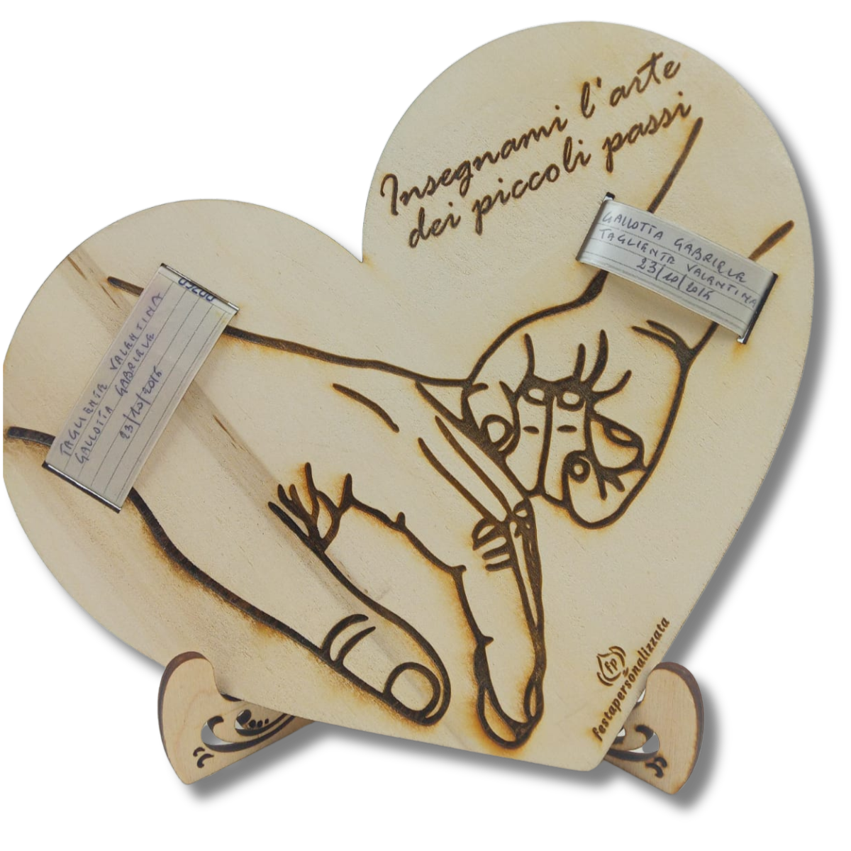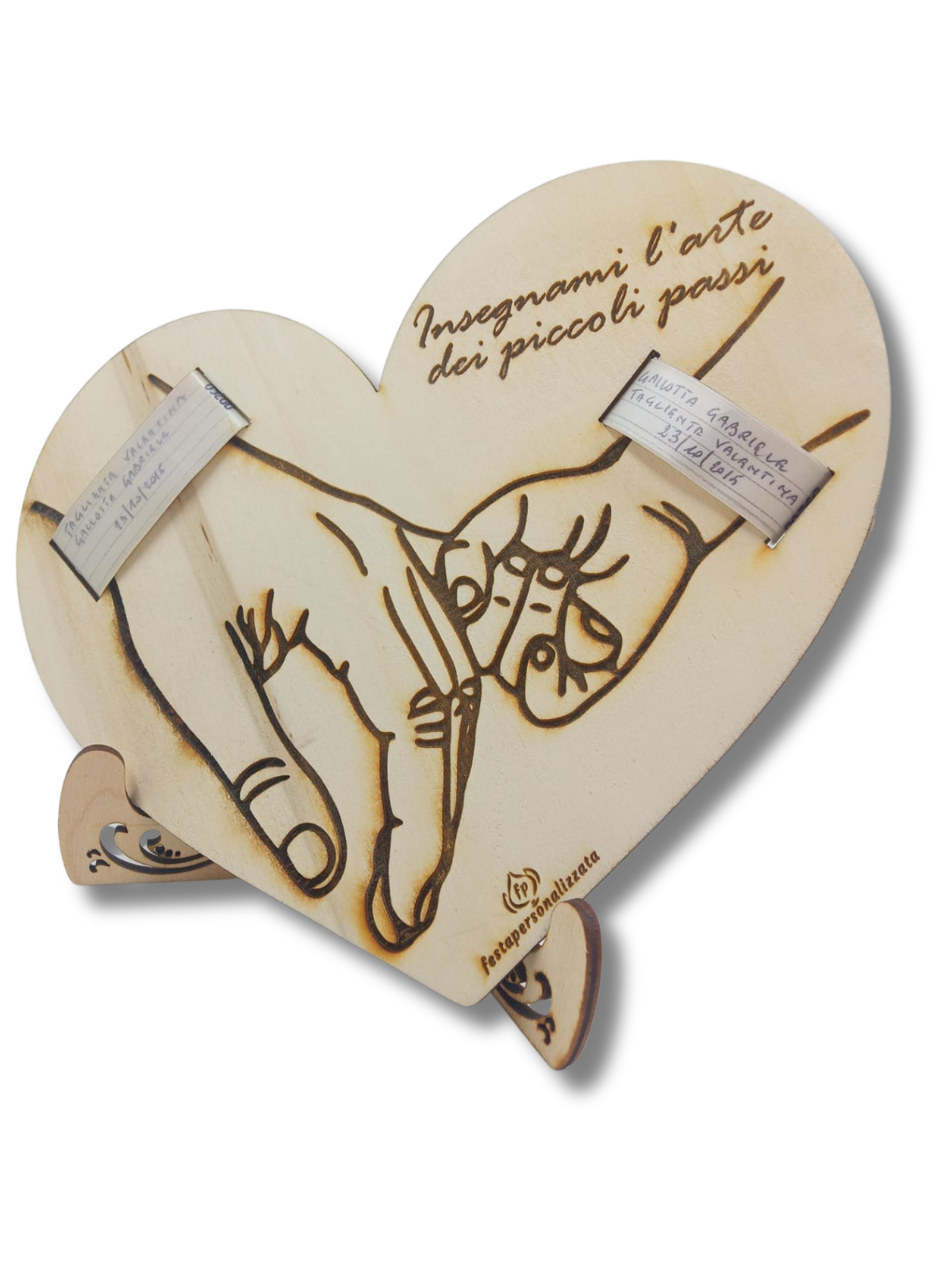 - Design: Spazio dedicato per il braccialetto della mamma e del bambino, con elegante forma a cuore