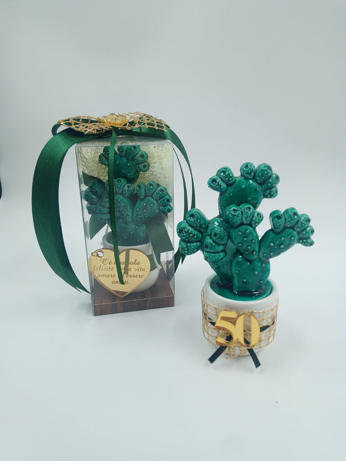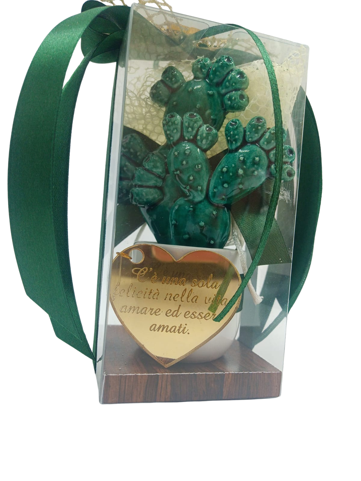 Porta un tocco di autentica artigianalità pugliese al tuo evento con la bomboniera “Gioie di Puglia”. Questa splendida pianta di fico d’india in ceramica, realizzata interamente a mano dai maestri ceramisti di Grottaglie (TA), è un simbolo di tradizione e qualità, perfetto per celebrare ogni occasione speciale.