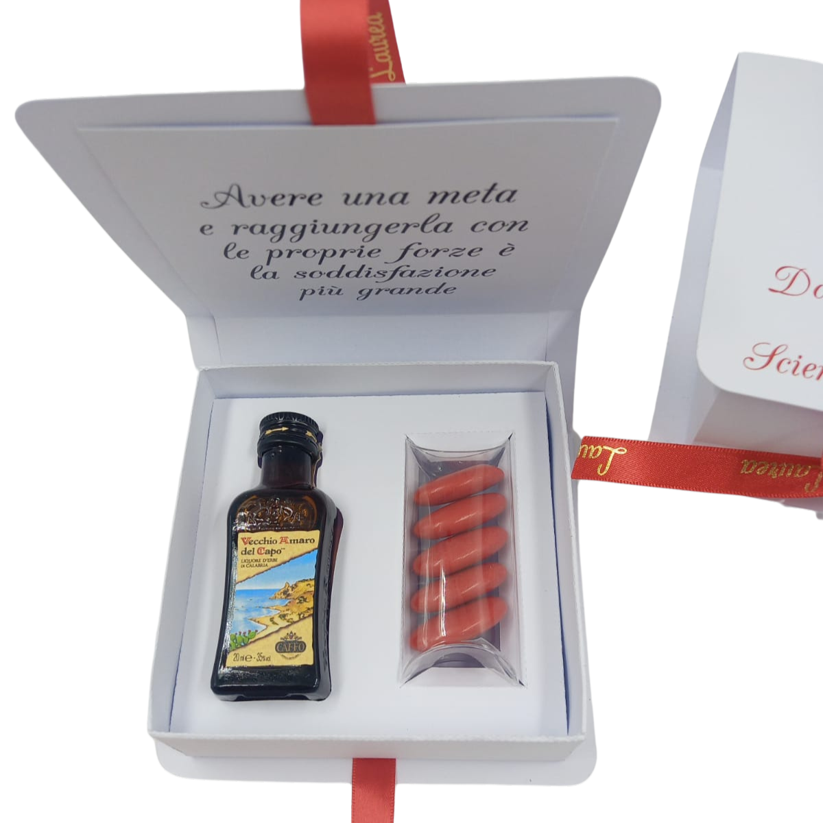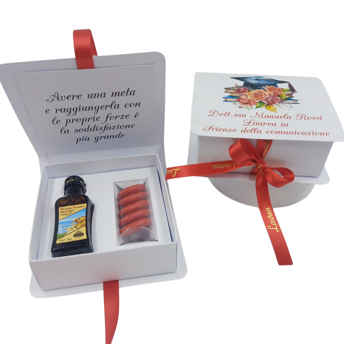Celebra i momenti speciali con stile grazie alla nostra scatola personalizzata in cartoncino, completa di una bottiglietta a scelta e un elegante contenitore con confetti. Perfetta per lauree, anniversari, matrimoni o qualsiasi altra occasione importante.