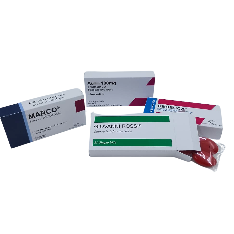 Assicurati di specificare la grafica e il testo desiderato per personalizzare le tue scatole di finti farmaci. La nostra attenzione ai dettagli garantirà che ogni scatola sia perfetta per il tuo evento, offrendo un tocco di originalità e divertimento.