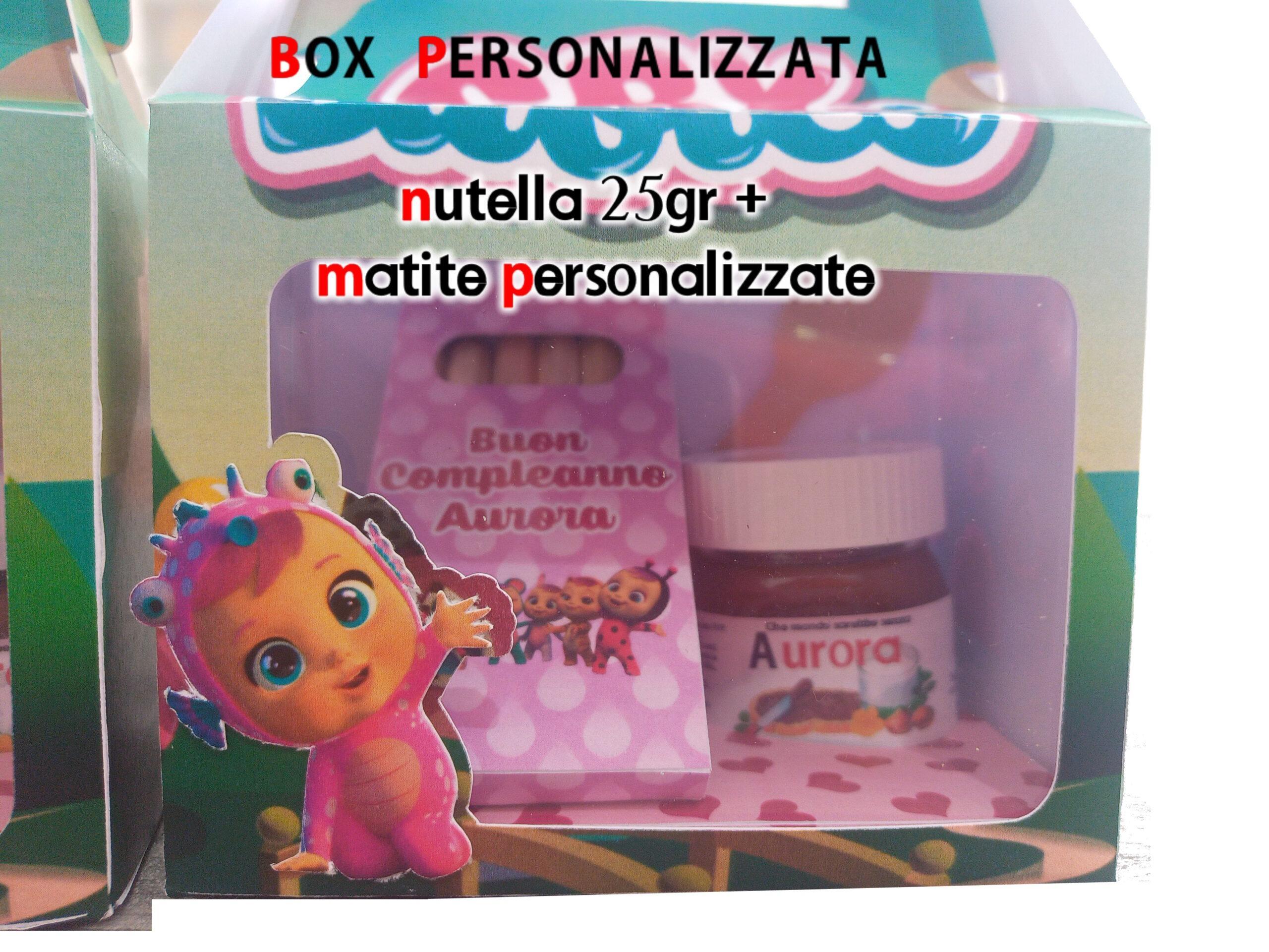 Scatolina personalizzata per qualsiasi evento, realizzabile con qualsiasi tema o colore, con all’interno 1 Nutella in vetro da 25gr e 1 confezione personalizzata con 6 matite di vari colori.