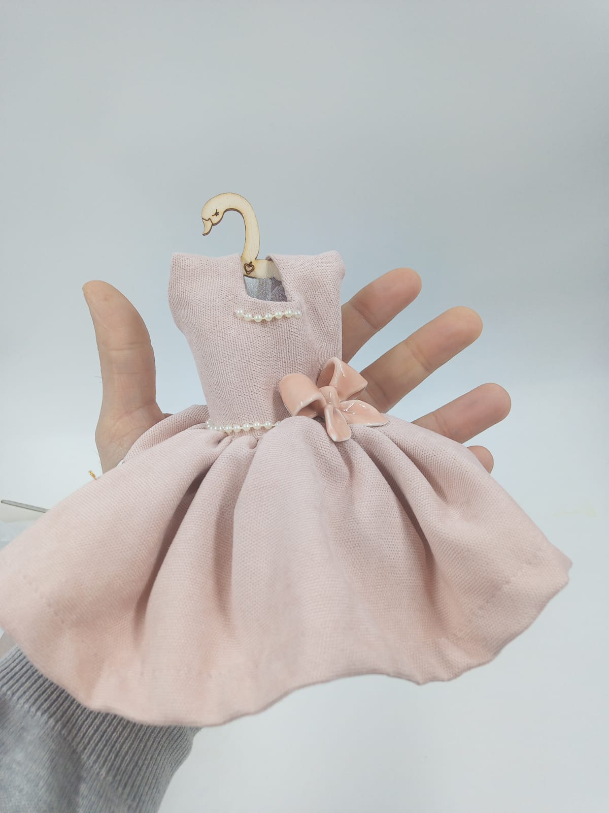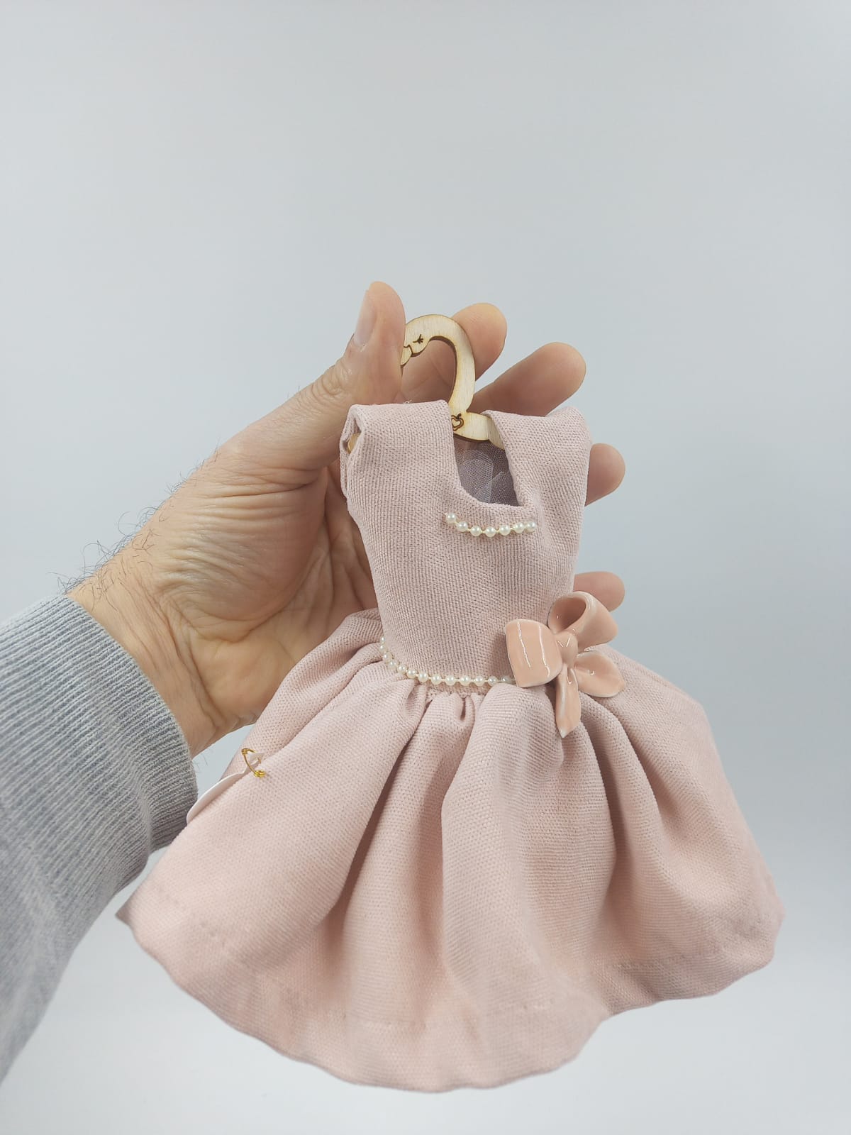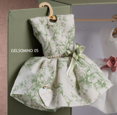 Un elegante vestitino in cotone manopesca profumato con in vita un bellissimo fiore o fiocco in porcellana di Capodimonte. La dimensione di questo vestitino, lascerà tutti di stucco grazie ai suoi 19cm di altezza.